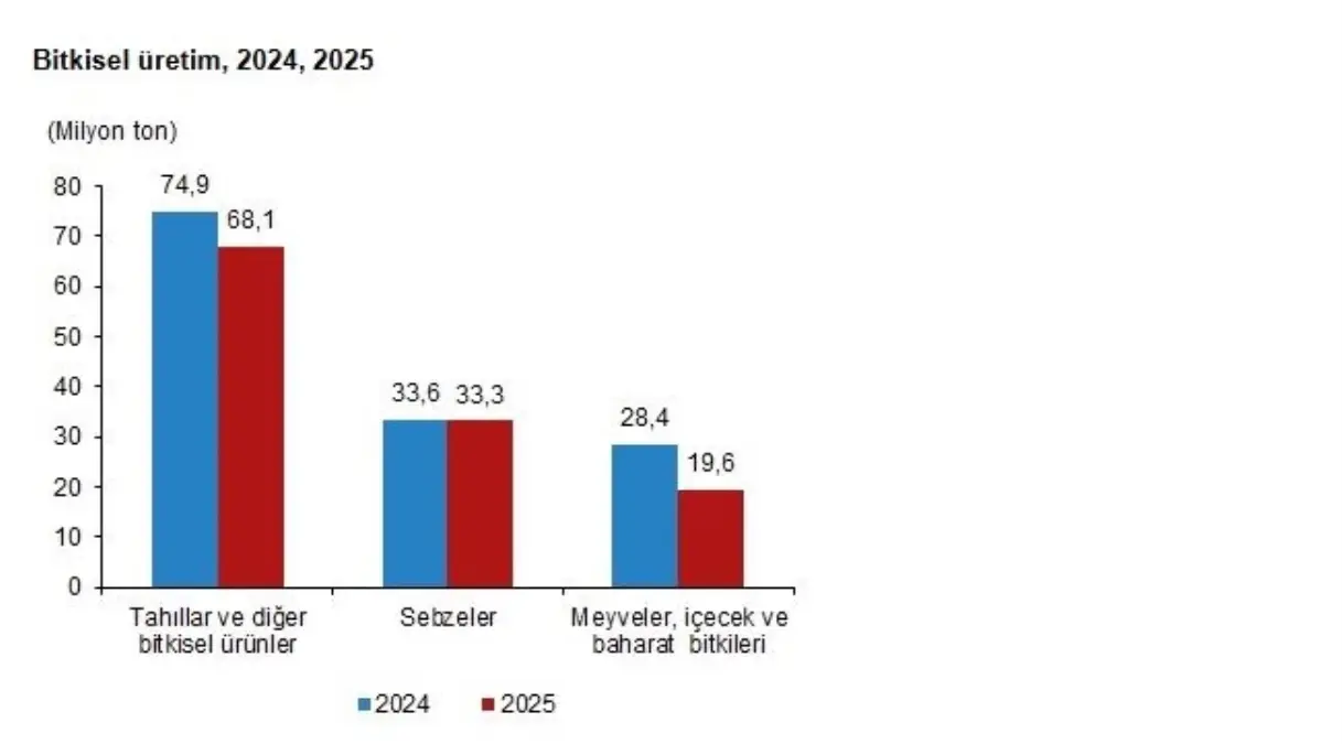TÜİK, 2025 yılına ilişkin bitkisel üretim istatistiklerini açıkladı. Buna göre; üretim miktarları 2025 yılında bir önceki yıla göre tarla ürünleri olan tahıllar ve diğer bitkisel ürünlerde (yem bitkileri hariç) yüzde 9, sebzelerde yüzde 0,9, meyveler, içecek ve baharat bitkilerinde yüzde 30,9 oranında azaldı. Yaklaşık üretim miktarları tahıllar ve diğer bitkisel ürünlerde 68,1 milyon ton, sebzelerde 33,3 milyon ton, meyveler, içecek ve baharat bitkilerinde ise 19,6 milyon ton olarak gerçekleşti.