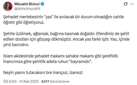 Şehitler için milli yas ilan edilmesini isteyen yurttaşlara ağır sözlerle yüklenen Birinci, paylaşımında şu ifadeleri kullandı: