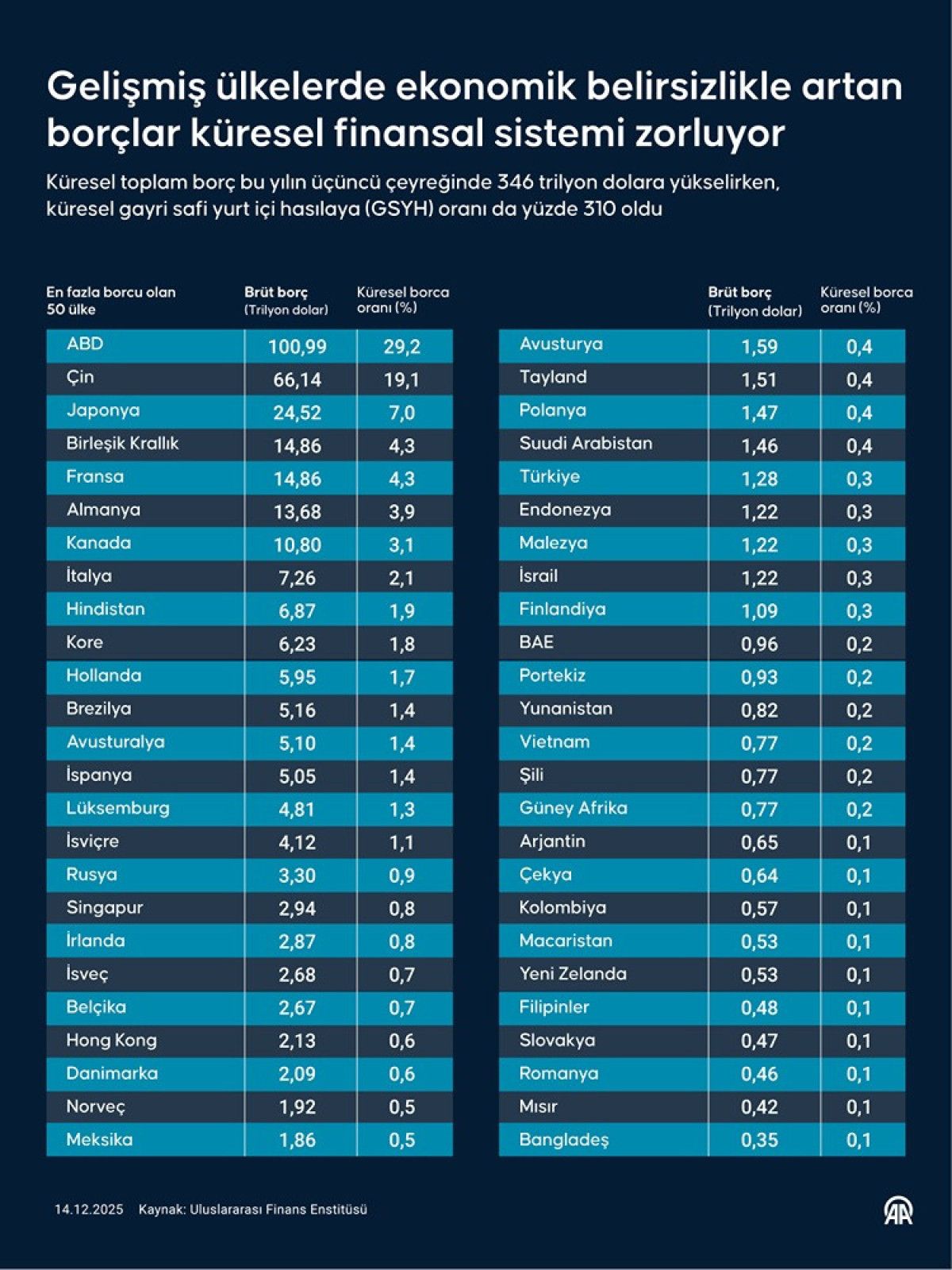 Türkiye bu tabloda yüksek borçlu ülkeler arasında değil, küresel borcun çok sınırlı bir kısmını (Yüzde 0,3) oluşturuyor ve 1,28 trilyon dolar borçla sistemik risk açısından ilk sıralardaki ülkelerle aynı kategoride değerlendirilmiyor.