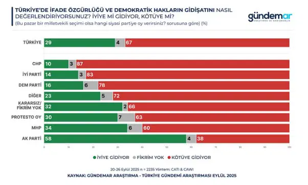 Katılımcıların yüzde 67’si, Türkiye’de ifade özgürlüğü ve demokratik hakların kötüye gittiğini düşünüyor. Yalnızca yüzde 29 “iyiye gidiyor” diyor. Demokratik haklarda iyileşme olduğunu düşünenlerin oranı iktidar seçmeninde daha yüksek (AK Parti yüzde 58, MHP yüzde 34).