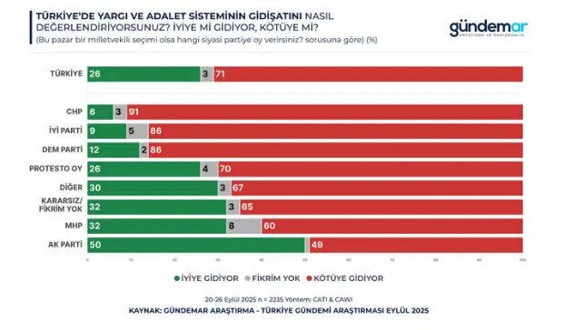 Katılımcıların yüzde 71’i, Türkiye’de yargı ve adalet sisteminin kötüye gittiğini düşünüyor. Yalnızca yüzde 26 “iyiye gidiyor” diyor. Olumlu değerlendirmeler en çok iktidar seçmeninde görülüyor (AK Parti yüzde 50, MHP yüzde 32). Muhalefet seçmeninde ise tablo net biçimde olumsuz; CHP’de yüzde 91, İYİ Parti’de yüzde 86, DEM Parti’de yüzde 86 kötüye gidiş görüşünde.